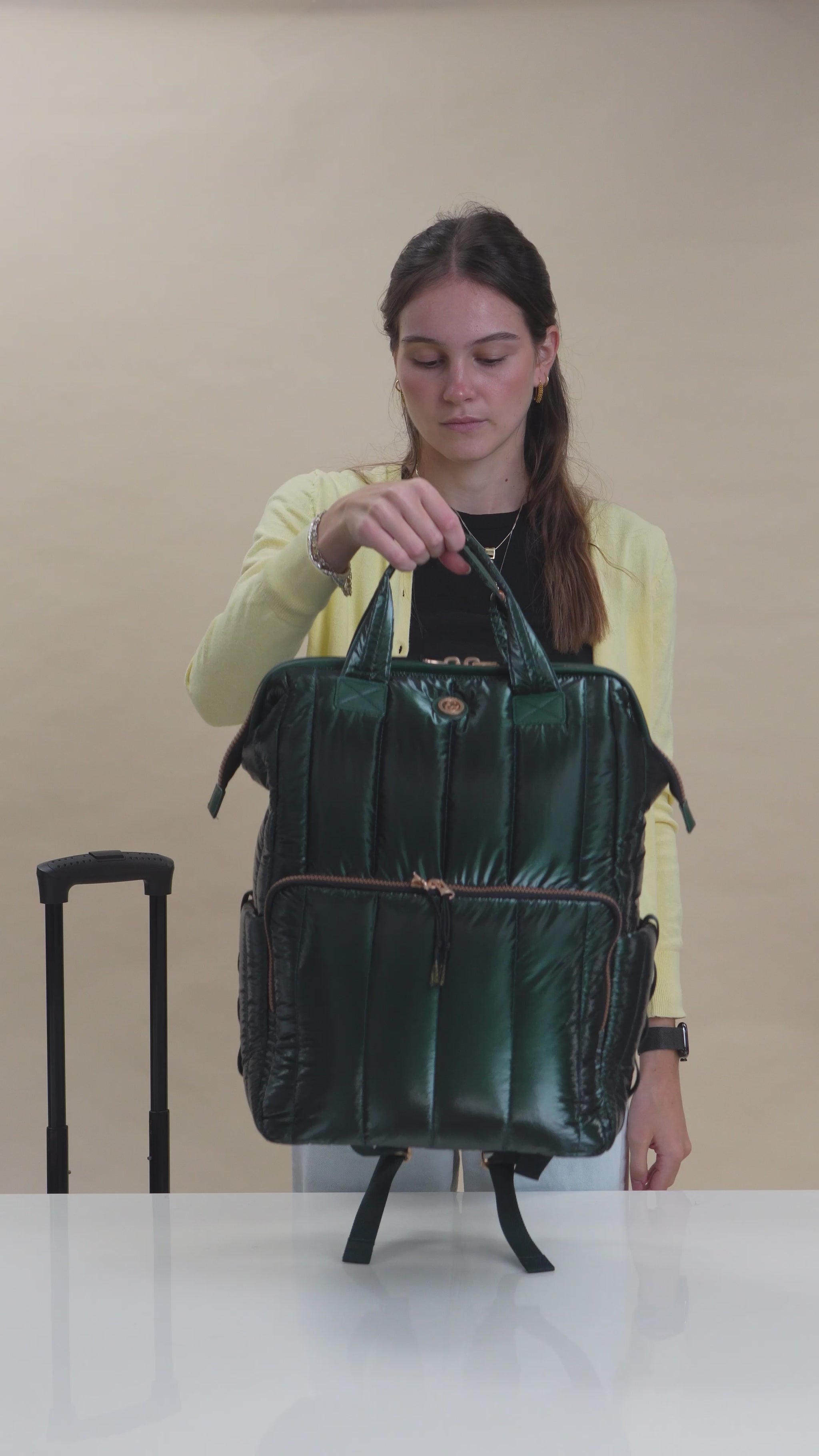 The Joan & David Tubular Quilted Metallic Puffer Nylon Workbook Backpack is the perfect blend of style and utility. Designed with a sleek square frame, a detachable pouch, and thoughtful compartments, this backpack keeps you organized and chic for work, school, or daily errands.
